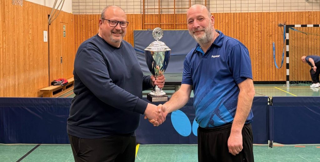 Am vergangenen Donnerstag wurde dem amtierenden Stadtmeister Claudius Röttgen (rechts) der Wanderpokal vom Abteilungsleiter (Bernd Ockenfels) überreicht. Nach der Übergabe sagte Röttgen „obwohl der Stadtmeister bereits im vergangenen November